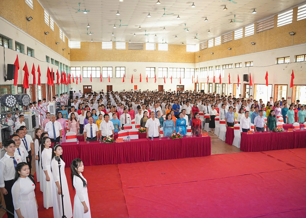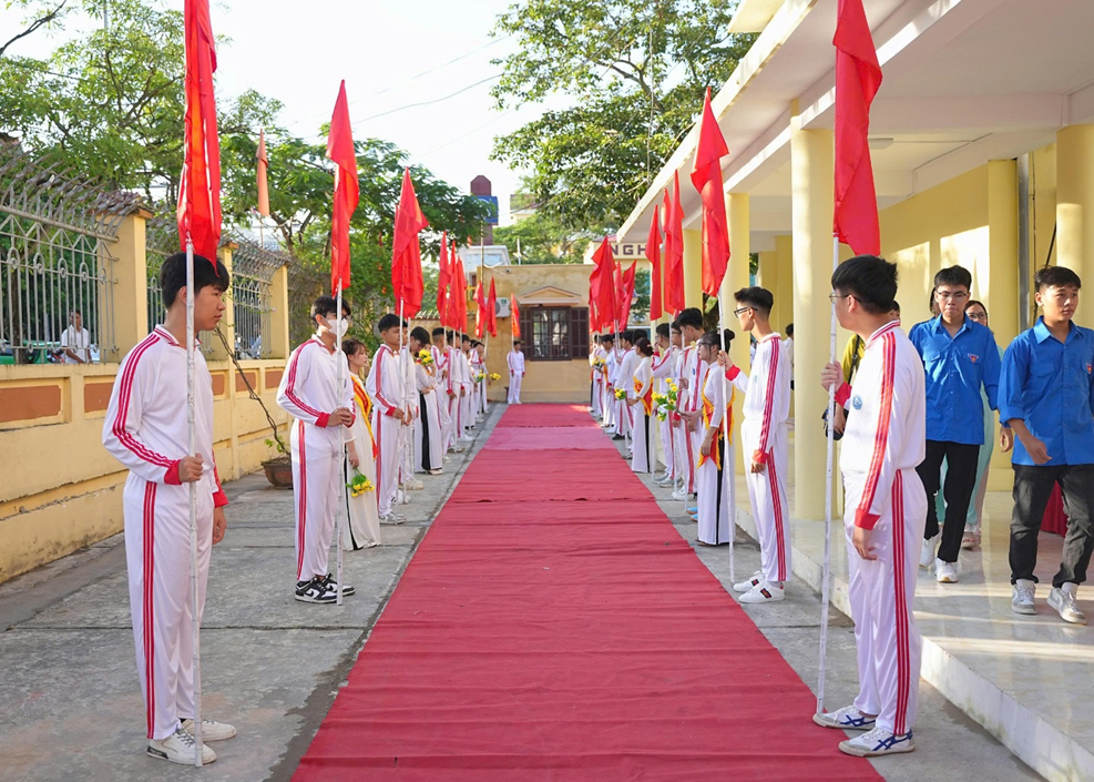Đội hồng kỳ và đội hình lễ tân, thanh niên tình nguyện tại Lễ Khai giảng