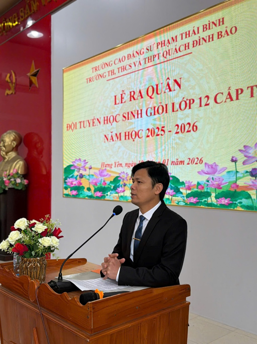 Sáng thứ Bảy, ngày 10/01/2026, Trường TH, THCS và THPT Quách Đình Bảo – đơn vị trực thuộc Trường Cao đẳng Sư phạm Thái Bình đã tổ chức Lễ ra quân đội tuyển học sinh giỏi cấp Tỉnh lớp 12 năm học 2025 – 2026. Đây là hoạt động nhằm động viên, khích lệ tinh thần học tập, rèn luyện của học sinh các đội tuyển trước khi tham gia kỳ thi học sinh giỏi cấp Tỉnh, đồng thời thể hiện sự quan tâm của nhà trường đối với công tác phát hiện, bồi dưỡng học sinh giỏi.