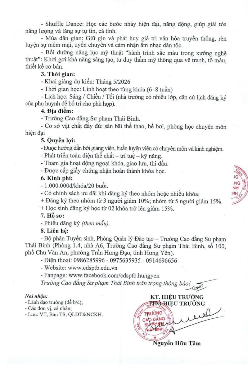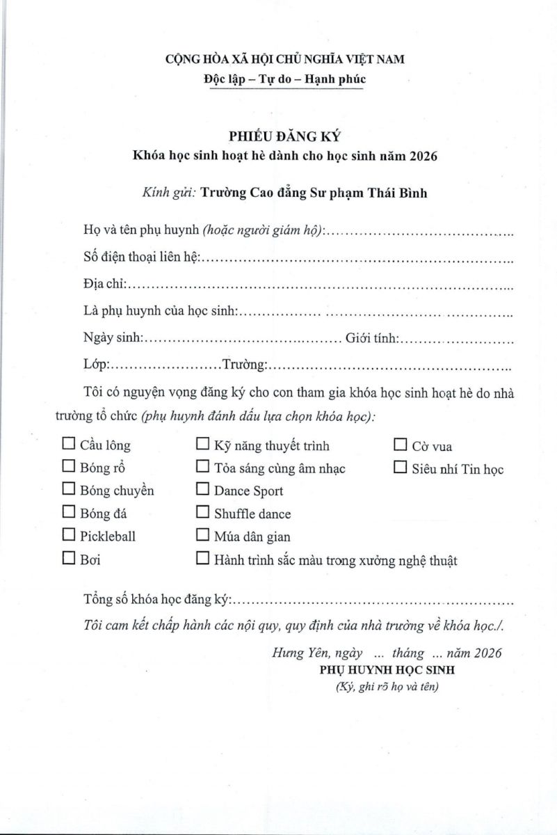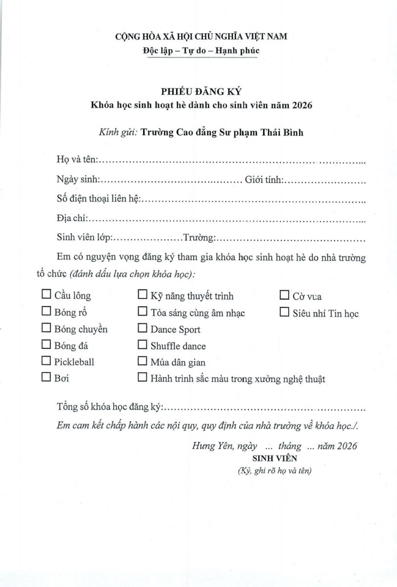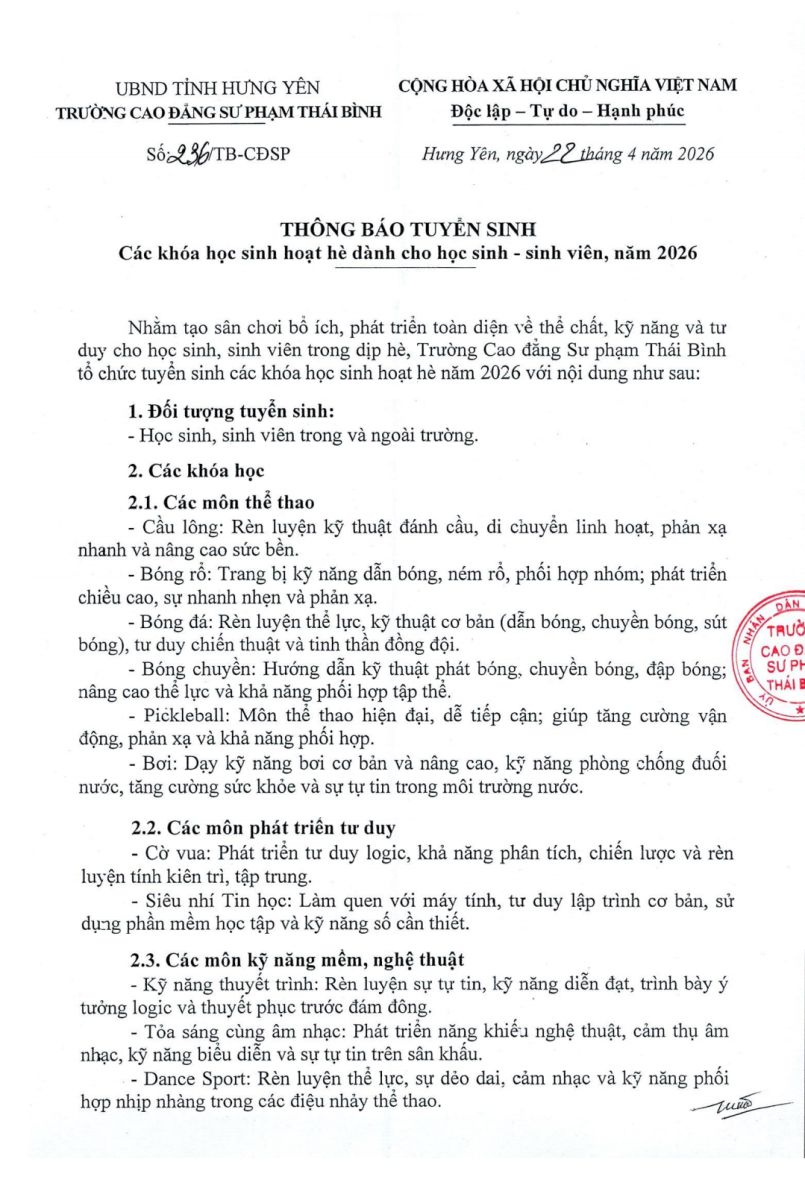Thông báo Tuyển sinh Các khóa học sinh hoạt hè cho học sinh - sinh viên, năm 2026
