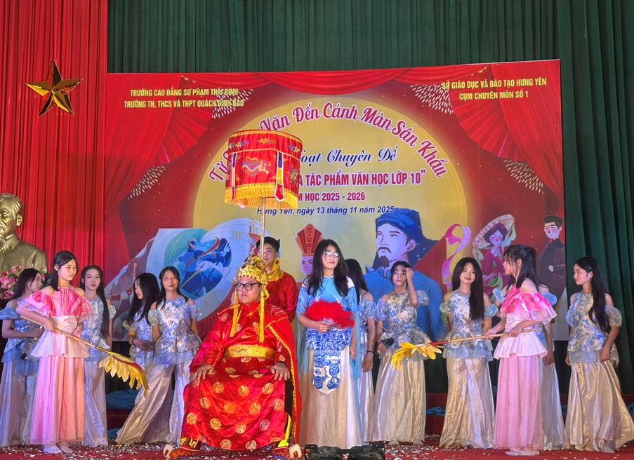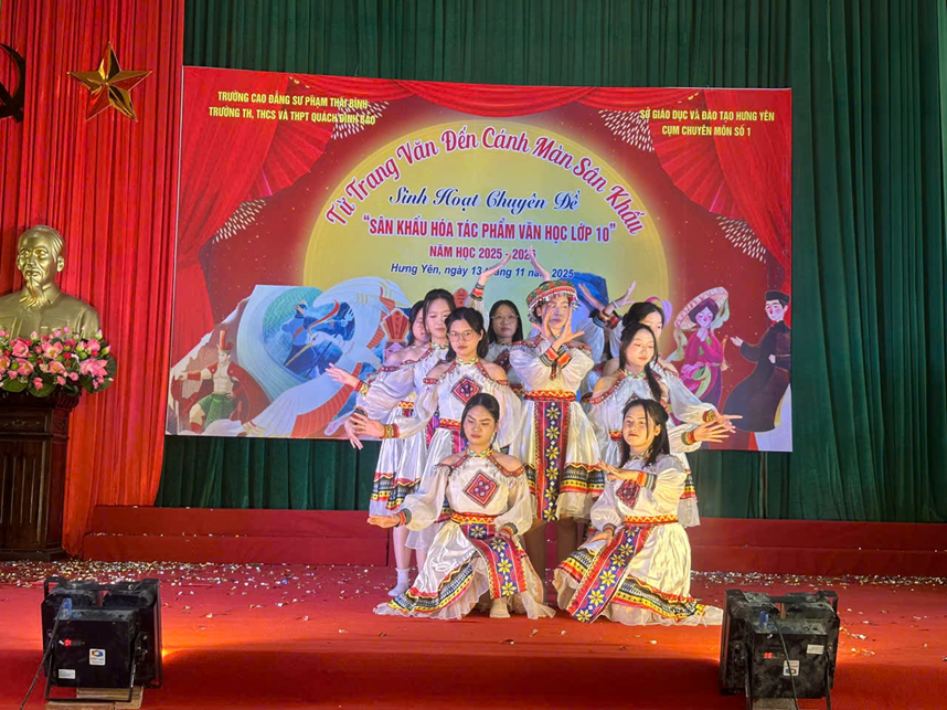 Ngày 13 tháng 11 năm 2025, Trường TH, THCS và THPT Quách Đình Bảo đã tổ chức buổi sinh hoạt chuyên môn cụm 1 với chuyên đề “Sân khấu hóa tác phẩm văn học – Khơi nguồn cảm hứng học văn”. Buổi sinh hoạt vinh dự có sự tham dự của cô Lộ Thị Phương – Chuyên viên Phòng Giáo dục Trung học, Sở Giáo dục và Đào tạo Hưng Yên; Tiến sĩ Phạm Thị Ánh Nguyệt – Bí thư Đảng ủy, Hiệu trưởng Trường Cao đẳng Sư phạm Thái Bình; đại diện Ban lãnh đạo các cơ sở giáo dục, giáo viên môn Ngữ văn trong Cụm chuyên môn số 1 cùng toàn thể cán bộ, giáo viên và học sinh nhà trường.